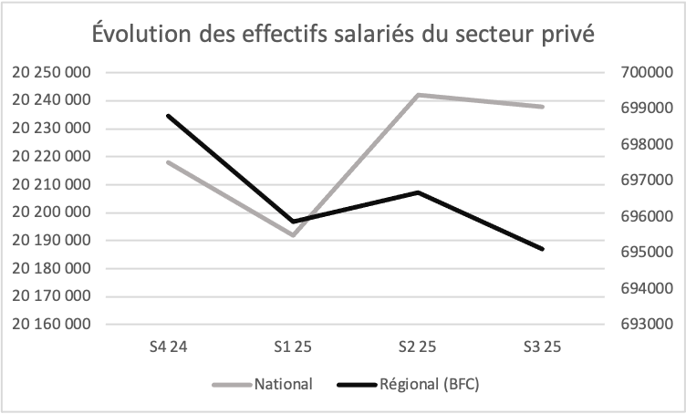 En 2025, les effectifs salariés du secteur privé reculent en France, avec une contraction encore plus prononcée en Bourgogne-Franche-Comté. Sur un an, le bilan national s’établit à -0,2 %, tandis que la région enregistre une baisse nettement plus marquée de -0,9 %.